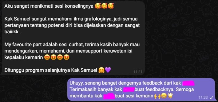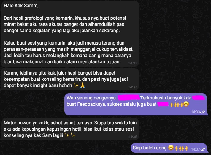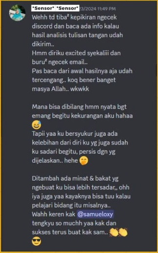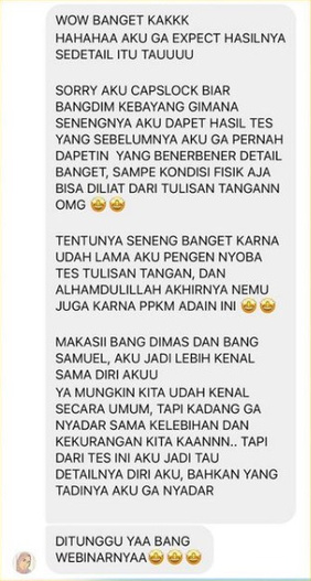 Awalnya saya skeptis dan gak percaya sama akurasi dari grafologi. Sampe akhirnya saya mencoba sendiri dan ternyata hasilnya sungguh luar biasa!
